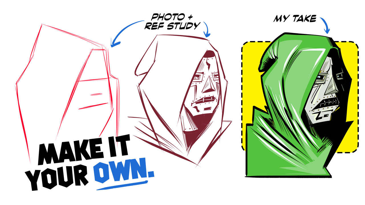 My latest video focuses on a few techniques I employ when drawing popular characters, using a combination of photos and reference illustration to map the character onto a different pose. To demonstrate the process, I selected an image of Dr. Doom, drawn by Jack Kirby, and an unrelated photo of a cloaked figure, facing a different direction.